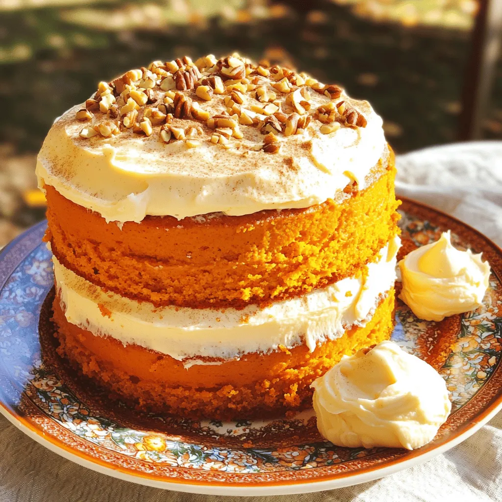 - 2 cups all-purpose flour - 2 teaspoons baking powder - 1 teaspoon baking soda - 1 teaspoon ground cinnamon - 1 teaspoon ground nutmeg - ½ teaspoon ground ginger - ½ teaspoon salt - 1 cup granulated sugar - ½ cup brown sugar, packed - 1 cup vegetable oil - 4 large eggs - 1 ½ cups pumpkin puree - 1 teaspoon vanilla extract - 8 oz cream cheese, softened - ½ cup powdered sugar - 1 teaspoon vanilla extract (for frosting) - ½ cup heavy cream (for frosting) To create this yummy Pumpkin Cream Cheese Layer Cake, let’s start with the ingredients. First, we have our dry ingredients. We need all-purpose flour, baking powder, baking soda, cinnamon, nutmeg, ginger, and salt. Each of these adds flavor and helps the cake rise. Next, let’s look at the wet ingredients. We have granulated sugar and brown sugar to sweeten our cake. The vegetable oil keeps it moist, and the eggs bind everything together. Pumpkin puree gives it that rich, fall flavor, while vanilla extract adds a hint of sweetness. For the frosting, we need cream cheese, powdered sugar, and a touch of vanilla for flavor. The heavy cream helps make the frosting light and fluffy. When we mix all these ingredients right, we create a layered cake that is not only tasty but also looks beautiful on the plate. Gather these ingredients and enjoy the process of baking. Each one plays a key role in making your dessert a delight! 1. Preheat your oven to 350°F (175°C). Grease and flour two 9-inch round cake pans. 2. In a medium bowl, whisk together the dry ingredients: flour, baking powder, baking soda, cinnamon, nutmeg, ginger, and salt. Set this bowl aside. 3. In a large bowl, mix the wet ingredients: granulated sugar, brown sugar, and vegetable oil. Beat until well combined. 4. Add the eggs one by one, mixing well after each addition. Then, stir in pumpkin puree and vanilla extract until the mix is smooth. 5. Gradually add the flour mix into the pumpkin mix. Stir until just combined; avoid overmixing. 6. Divide the batter evenly between the prepared pans. Bake for 25 to 30 minutes. A toothpick should come out clean when inserted into the center. 7. Let the cakes cool in the pans for 10 minutes. Then, transfer them to wire racks to cool completely. 8. While the cakes cool, prepare the cream cheese frosting. In a medium bowl, beat the softened cream cheese until it is smooth. 9. Gradually add powdered sugar and vanilla extract. Mix until well combined. 10. In another bowl, whip the heavy cream until soft peaks form. Gently fold this into the cream cheese mix until blended. 11. Once the cakes are fully cooled, place one layer on a serving plate. Spread a generous amount of cream cheese frosting on top. 12. Add the second cake layer on top of the frosted layer. Spread more frosting on top and around the sides of the cake. 13. For decoration, sprinkle pumpkin spice, chopped nuts, or a dash of cinnamon on top if you wish. For a lovely presentation, slice the cake and serve on decorative plates. Add a dollop of extra frosting on the side and garnish with a small piece of pumpkin and a light sprinkle of cinnamon. Enjoy this delightful treat! To ensure even baking, follow these steps: - Oven Temperature: Always preheat your oven to 350°F (175°C). This helps the cake rise nicely. - Pan Preparation: Grease and flour your cake pans well. This stops the cake from sticking. - Check for Doneness: Use a toothpick to test the center. If it comes out clean, your cake is ready. For measuring ingredients, use these tools: - Dry Measuring Cups: Use them for flour and sugar. Fill to the top and level off. - Liquid Measuring Cups: Use them for oil and pumpkin puree. Look at the meniscus for accuracy. - Kitchen Scale: Weighing ingredients gives the best results, especially for baking. To achieve the perfect cream cheese frosting, try these tips: - Softened Cream Cheese: Make sure your cream cheese is at room temperature. This helps it blend smoothly. - Gradual Sugar Addition: Add powdered sugar little by little. This prevents lumps in your frosting. - Whipped Cream: Fold in whipped cream gently. This keeps the frosting light and fluffy. Avoid common frosting mistakes: - Overmixing: Mix just until combined. Overmixing can make the frosting runny. - Too Much Sugar: If your frosting is too sweet, add a pinch of salt. This balances the flavors. For slicing and serving the cake: - Use a Sharp Knife: A sharp knife gives clean slices. Dip it in warm water for best results. - Chill the Cake: If the cake is too soft, chill it for 30 minutes. This makes slicing easier. For garnishing ideas: - Pumpkin Spice: Sprinkle some pumpkin spice on top for extra flavor. - Chopped Nuts: Add some chopped nuts for texture. Walnuts or pecans work well. - Cinnamon Sprinkle: A light sprinkle of cinnamon adds a nice touch. It looks pretty and tastes great! {{image_2}} You can take this cake to the next level by adding chocolate or caramel. Just swirl some melted chocolate or drizzle caramel on top of the cream cheese frosting. It adds a rich taste that pairs well with the pumpkin flavor. You can also try different spices. Adding cardamom or allspice gives a unique twist to the classic taste. If you need a gluten-free option, swap all-purpose flour for a gluten-free blend. Make sure it has a good balance of flours. For a vegan version, use a plant-based oil and replace eggs with flax eggs or applesauce. You can also make the frosting vegan by using a vegan cream cheese alternative. For holiday-themed additions, consider adding cranberries or pecans. They not only enhance the flavor but also add a festive look. You can even use seasonal fruits like apples or pears. Chopped nuts also bring a nice crunch and flavor to each slice. Store leftover cake in the fridge. Wrap each piece in plastic wrap. This keeps the cake fresh. Place the wrapped cake in an airtight container. It will stay good for about five days. To extend shelf life, avoid cutting the cake until ready to serve. Keeping it whol