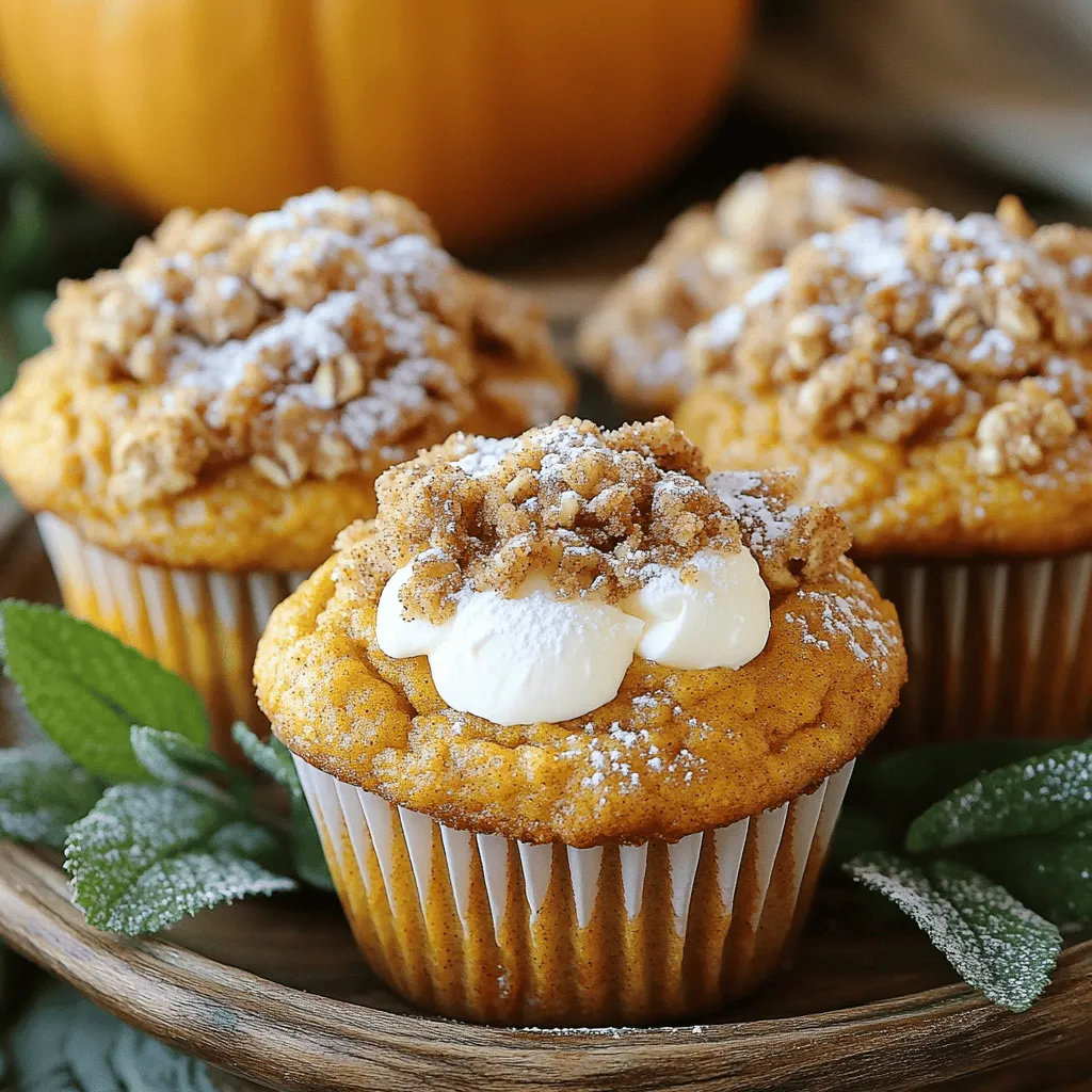 - 1 cup all-purpose flour - 1 cup whole wheat flour - 1 teaspoon baking powder - 1 teaspoon baking soda - 1 teaspoon ground cinnamon - ½ teaspoon ground nutmeg - ½ teaspoon ground ginger - ½ teaspoon salt I love using both all-purpose and whole wheat flour. This mix gives the muffins a nice texture. Baking powder and baking soda help them rise. The spices add warmth. Cinnamon, nutmeg, and ginger bring that cozy fall vibe. A pinch of salt balances everything out and enhances the flavors. - 1 cup pumpkin puree (canned or fresh) - ½ cup granulated sugar - ½ cup brown sugar, packed - 2 large eggs - ½ cup vegetable oil - 1 teaspoon vanilla extract - 4 ounces cream cheese, softened - 1 tablespoon milk Pumpkin puree is the star here. It gives moisture and rich flavor. I use both granulated and brown sugars for sweetness. Brown sugar adds depth. Eggs bind everything together and create a soft texture. Vegetable oil keeps the muffins moist, while vanilla extract provides a lovely aroma. Cream cheese adds creaminess, making these muffins special. A splash of milk helps blend everything smoothly. - ½ cup all-purpose flour - ¼ cup brown sugar, packed - ¼ teaspoon ground cinnamon - ¼ cup unsalted butter, softened - ¼ cup oats (optional) The streusel topping is a must. It adds crunch and sweetness. I mix all-purpose flour and brown sugar for flavor. Ground cinnamon gives it warmth, too. The softened butter brings it all together. Oats are optional, but they add extra texture and heartiness. First, preheat your oven to 350°F (175°C). This step gets your oven ready for baking. Next, prepare your muffin tin. You can use paper liners or grease it well with oil or butter. This helps the muffins come out easily. In a large bowl, whisk together the all-purpose flour, whole wheat flour, baking powder, and baking soda. Add in the ground cinnamon, nutmeg, ginger, and salt. Mix these dry ingredients until they blend well. This creates a strong base for your muffins. In another bowl, mix the pumpkin puree with the granulated sugar and brown sugar. Then, add the eggs, vegetable oil, and vanilla extract. Whisk this mixture until it is smooth. This adds moisture and flavor to the muffins. Gradually add the wet mixture to the dry ingredients. Stir gently until they are just combined. Be careful not to over-mix. Over-mixing can make the muffins tough instead of light and fluffy. In a small bowl, beat the softened cream cheese with 1 tablespoon of milk. Mix until it is creamy. This filling adds a rich taste to the muffins. In another bowl, combine the all-purpose flour, brown sugar, and ground cinnamon. If you like, add oats for extra texture. Cut in the softened butter with a fork until it looks like coarse crumbs. This topping adds a sweet crunch to each muffin. Start by dividing half of the muffin batter evenly among the muffin cups. Then, add a small dollop of the cream cheese mixture into the center of each cup. After that, top with the remaining muffin batter, filling each cup about three-quarters full. Place the muffin tin in the oven and bake for 20-25 minutes. Check with a toothpick to see if they are done. If it comes out clean, they are ready. Once baked, let the muffins cool in the pan for about five minutes. Then, transfer them to a wire rack to cool completely. To keep your muffins moist, avoid over-mixing the batter. Mix just until the dry and wet ingredients blend. Over-mixing creates tough muffins. Also, use quality ingredients. Fresh pumpkin puree makes a big difference. Fresh spices add great flavor, too. Serve your muffins warm for the best taste. A light dusting of powdered sugar makes them look fancy. You can also add a dollop of whipped cream cheese on top. For a pretty display, place muffins on a decorative plate. Add a few mint leaves around them for color. If your muffins turn out dry, check your baking time. Overbaking can dry them out fast. Always set a timer and check a few minutes early. If you notice your muffins are too brown, lower the oven temperature next time. {{image_2}} You can make these muffins even better with a few fun additions. Adding nuts like walnuts or pecans gives them a nice crunch. Just chop the nuts and fold them into the batter before you fill the muffin cups. You could also mix in chocolate chips for a sweet twist. Use semi-sweet or dark chocolate chips, depending on your taste. These additions can really brighten up each muffin. If you want to try different sweeteners, honey or maple syrup work well. Both add a unique flavor and moisture to the muffins. When using honey or maple syrup, replace the granulated sugar. Use about ¾ of the amount listed for sugar. For example, if the recipe calls for ½ cup of sugar, use about ⅓ cup of honey or maple syrup. This change keeps your muffins sweet and delicious. You can make these muffins a bit healthier too. Try using gluten-free flour alternatives, like almond flour or coconut flour. These options will change the flavor but still taste great. If you want to reduce sugar, cut down the granulated and brown sugar by ¼ cup. You can also add applesauce to keep the muffins moist. These swaps help everyone enjoy this treat, no matter their diet. To keep your muffins fresh, store them at room temperature. Use an airtight container to seal in moisture. This helps prevent them from drying out. Muffins stay good for about three days when stored this way. If you want to save muffins for later, freezing is a great option. Place the muffins in a freezer-safe bag or container. Make sure to remove as much air as possible. They can last up to three months in the freezer. When you’re ready to enjoy them, reheating is easy. Simply take the muffins out and let them thaw. You can warm them in the oven at 350°F for about 10-15 minutes. This will bring back their soft texture and delicious flavor. To check if your muffins are done, use the toothpick test. Insert a toothpick into the center of a muffin. If it comes out clean or