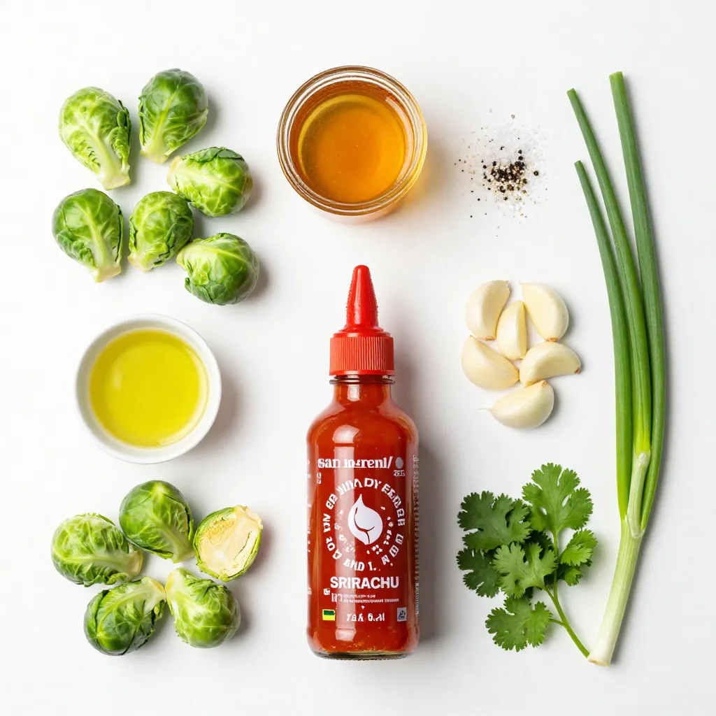 Brussels sprouts star in this dish. They are small, round, and tasty. Halve them to help them cook well. Olive oil gives them a nice shine. Honey adds a sweet touch. Sriracha brings the heat. Garlic gives a strong flavor.