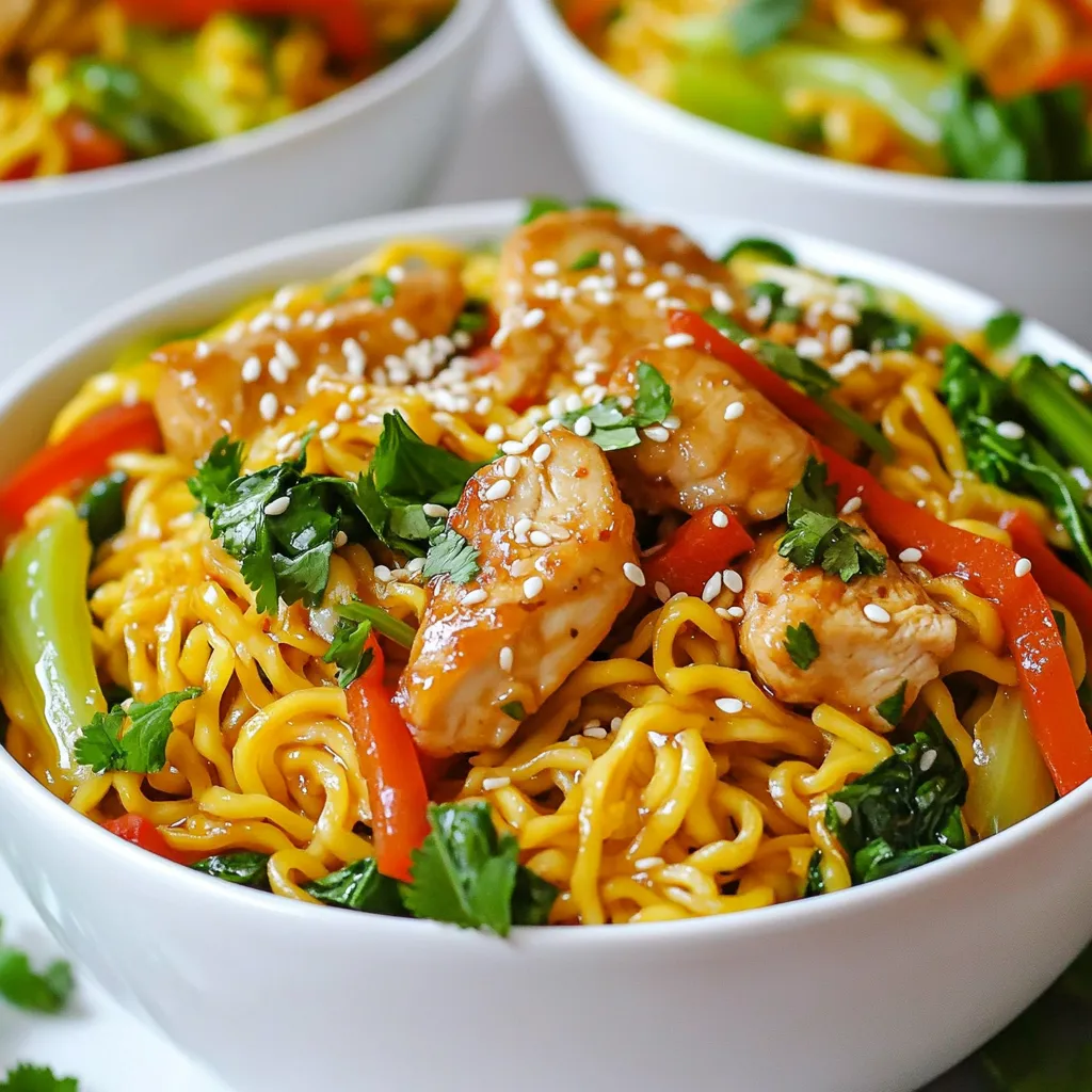 - 200g egg noodles - 2 chicken breasts, sliced thinly - 4 cloves garlic, minced - 3 tablespoons soy sauce - 2 tablespoons honey - 1 tablespoon sesame oil - 1 tablespoon ginger, grated - 1 tablespoon rice vinegar - 1 red bell pepper, thinly sliced - 1 cup bok choy, chopped - Sesame seeds for garnish - Fresh cilantro for garnish - Salt and pepper to taste - Egg Noodles: These noodles give a nice texture. You can use rice noodles if you need a gluten-free option. - Chicken Breasts: Thin slices cook well. You can swap chicken for tofu or shrimp for a different flavor. - Garlic: Fresh is best for taste. Garlic powder can work in a pinch, but fresh adds more zing. - Soy Sauce: This adds salt and umami. Use tamari for a gluten-free version. - Honey: It adds sweetness. Maple syrup works as a vegan substitute. - Sesame Oil: This gives a nutty flavor. You can use olive oil, but the taste will change. - Ginger: Fresh ginger gives a great kick. Ground ginger can be used, but fresh is better. - Rice Vinegar: It adds acidity. You can use apple cider vinegar if needed. - Vegetables: Red bell pepper and bok choy add color and crunch. Feel free to mix in your favorite veggies. - Calories: 420 - Protein: 30g - Carbohydrates: 50g - Fat: 15g - Fiber: 3g - Sugar: 8g This dish is tasty and balanced. It has protein from the chicken and fiber from the veggies. Enjoy a flavorful meal that feels good too! {{ingredient_image_1}} Start by boiling a large pot of salted water. Once it boils, add 200g of egg noodles. Cook them until they are al dente, about 4-5 minutes. Drain the noodles and set them aside in a bowl. In a small bowl, combine the sauce ingredients. Whisk together 3 tablespoons of soy sauce, 2 tablespoons of honey, 1 tablespoon of sesame oil, 1 tablespoon of grated ginger, and 1 tablespoon of rice vinegar. Mix well until everything blends. Set this sauce aside for later. Next, heat a large skillet or wok on medium-high heat. Add a drizzle of oil to the hot skillet. Season your sliced chicken breasts with salt and pepper, then add them to the skillet. Cook the chicken for about 5-7 minutes until it turns golden and is fully cooked. Once the chicken is cooked, add 4 minced garlic cloves and 1 sliced red bell pepper to the skillet. Stir-fry these for around 2 minutes until they smell great and the pepper softens. Lastly, add 1 cup of chopped bok choy and cook for another 2-3 minutes until it wilts. Now, it’s time to bring it all together. Add the cooked noodles to the skillet with the chicken and veggies. Pour the sauce over the top. Gently toss everything to coat the noodles and ingredients evenly. Cook for another 2-3 minutes until heated through. Finally, remove the skillet from the heat. Serve the sticky garlic chicken noodles in deep bowls. Garnish with sesame seeds and fresh cilantro for a nice touch. Enjoy your meal! To make your sticky garlic chicken noodles shine, follow a few key tips. First, cook your egg noodles just until al dente. This keeps them firm and not mushy. After cooking, make sure to drain and rinse them under cold water. This stops the cooking and prevents them from sticking together. Next, use a hot skillet for sautéing. A hot pan helps brown the chicken evenly and gives it a nice texture. Balance is key for this dish. The sweetness from honey needs to match the saltiness of soy sauce. Adjust these to your taste. If you want a bit of heat, add a pinch of red pepper flakes. Also, don’t skip the fresh garlic and ginger; they add great depth. Finally, finish with a sprinkle of sesame seeds and fresh cilantro. These bright flavors elevate the dish. Watch out for a few common mistakes. First, don't overcook the chicken. It should be juicy and tender, not dry. Also, be careful with the garlic. Burnt garlic tastes bitter, so add it to the pan after the chicken has cooked for a minute. Lastly, don’t rush the mixing step. Toss everything gently to coat the noodles fully in the sauce. This ensures each bite is packed with flavor. Pro Tips Use Fresh Ingredients: Fresh garlic and ginger will enhance the flavor of your dish significantly compared to dried alternatives. Adjust Sauce to Taste: Feel free to modify the amount of soy sauce and honey to suit your taste preferences; you can make it saltier or sweeter as you like. Vegetable Variations: You can substitute bok choy with other leafy greens like spinach or kale, or add more veggies like carrots or snap peas for extra crunch. Meal Prep Friendly: This dish is great for meal prep; store leftovers in the fridge and reheat for a quick meal throughout the week. {{image_2}} You can switch the chicken for other meats. Try sliced beef or shrimp. Both options work well with the sauce. For a lighter dish, use turkey breast. Each protein has its own taste. Adjust cook times as needed. Beef needs more time to brown, while shrimp cooks quickly. For a vegetarian dish, use tofu instead of chicken. Firm tofu holds up well in stir-fries. Marinate the tofu in the sauce for extra flavor. If you want a vegan option, replace honey with maple syrup or agave nectar. Add more veggies like carrots or snap peas for added texture and taste. To make this dish gluten-free, use rice noodles or zucchini noodles. Both options are tasty and healthy. Check labels on soy sauce – some contain gluten. You can use tamari or coconut aminos as good gluten-free swaps. These changes let you enjoy sticky garlic chicken noodles without worries. After you enjoy your sticky garlic chicken noodles, let them cool. Place the leftovers in an airtight container. You can keep them in the fridge for up to three days. Make sure to seal it tight to keep the flavors fresh. If you want to save them longer, consider freezing instead. When you are ready to eat the leftovers, reheating is key. Use a skillet over medium heat for the best results. Add a splash of water or chicken broth to keep the noodles moist. Stir often until everything is heated through and hot. This method helps maintai