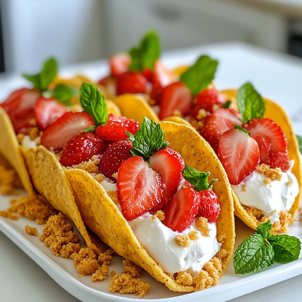 Next, add sliced strawberries on top. You can also sprinkle some finely diced strawberries for a nice crunch. If you like, garnish with a mint leaf for a fresh touch. Once assembled, place the tacos in the fridge for at least 30 minutes. This helps the filling firm up before serving.