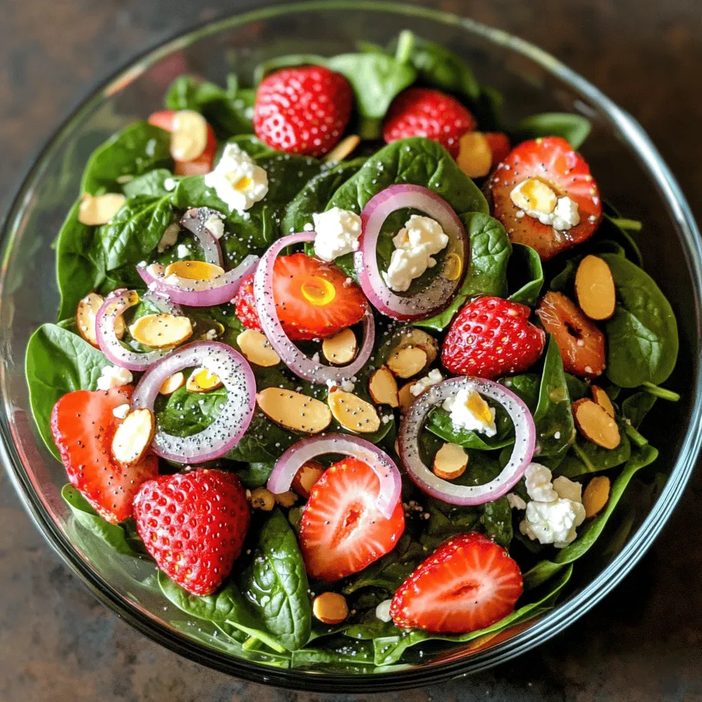 You can make this salad ahead of time with a few easy steps. First, wash and dry your spinach leaves. Store them in a dry container with a paper towel to absorb extra moisture. Keep the strawberries sliced and stored separately to avoid sogginess. You can also prepare the dressing in advance. Just mix olive oil, apple cider vinegar, honey, poppy seeds, salt, and pepper in a small jar. When you’re ready to serve, toss everything together. This method keeps your salad fresh and tasty.