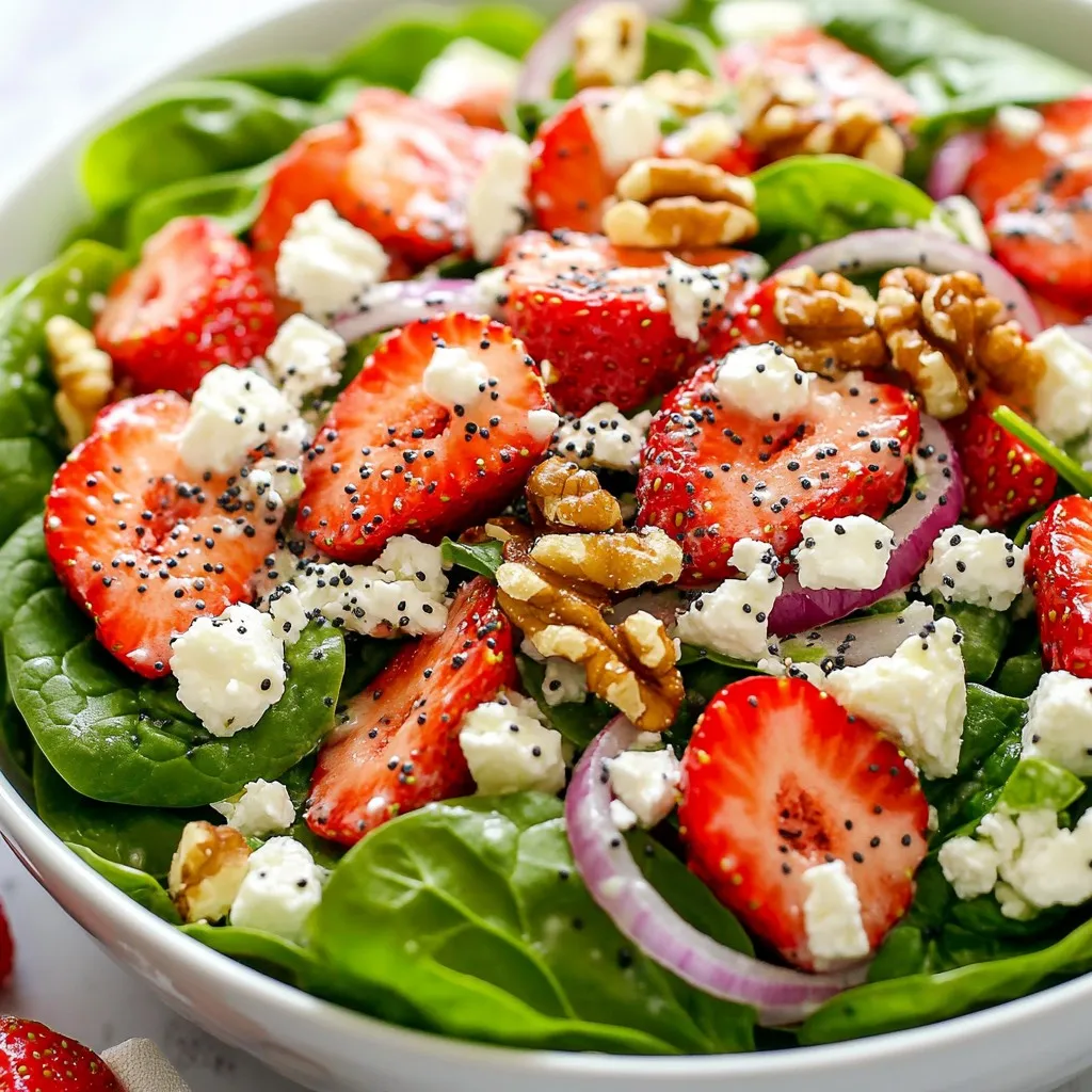 - 4 cups fresh baby spinach, washed and dried - 2 cups strawberries, hulled and sliced - 1/2 cup red onion, thinly sliced - 1/4 cup crumbled feta cheese - 1/4 cup walnuts, chopped To make this salad shine, fresh ingredients are key. I love using baby spinach for its tender leaves. Strawberries bring sweetness and color. The red onion adds a nice crunch and bite. Feta cheese gives the salad a salty note. Finally, walnuts add a rich texture. - 1/4 cup olive oil - 2 tablespoons apple cider vinegar - 1 tablespoon honey - 1 tablespoon poppy seeds - Salt and pepper, to taste Don’t forget the pantry staples! Olive oil forms the base of the dressing. Apple cider vinegar offers a tangy kick. Honey balances the flavors with sweetness. Poppy seeds add a lovely crunch. Season with salt and pepper for the perfect taste. Gather these ingredients to create a vibrant and tasty Strawberry Spinach Salad with Poppy Seed Dressing. {{ingredient_image_1}} Start with 4 cups of fresh baby spinach. First, wash and dry the spinach. Make sure it's clean and dry to avoid a soggy salad. Next, take 2 cups of strawberries. Hull them and slice them into thin pieces. You want sweet, juicy strawberries for the best flavor. In a large bowl, add the spinach. Arrange the sliced strawberries on top. Then, add 1/2 cup of thinly sliced red onion. The onion adds a nice crunch and bite. Next, sprinkle 1/4 cup of crumbled feta cheese over the mixture. The feta adds a creamy element. Finally, add 1/4 cup of chopped walnuts for extra crunch and flavor. In a separate small bowl, it’s time to make the poppy seed dressing. Whisk together 1/4 cup of olive oil, 2 tablespoons of apple cider vinegar, and 1 tablespoon of honey. Add 1 tablespoon of poppy seeds to the mix. Don’t forget to season with salt and pepper. Whisk until all the ingredients are well combined and slightly emulsified. Once ready, drizzle the dressing over the salad. Gently toss everything together to coat the greens and toppings evenly. Adjust the seasoning with more salt and pepper if needed. Enjoy your colorful and tasty salad! - Choosing the freshest strawberries Look for bright red strawberries. They should be firm and free from bruises. Fresh strawberries taste better and add great flavor to the salad. If you can, buy them from a local farm or farmers' market. This way, they are likely fresher and more flavorful. - Storing salad components separately To keep your salad fresh, store each item apart. Keep the spinach, strawberries, and dressing in different containers. This prevents sogginess. If you mix them too early, the salad will lose its crunch. Only combine them right before serving for the best taste. - Serving in decorative bowls Use colorful or unique bowls to serve your salad. A bright bowl makes the dish look more inviting. It also highlights the vibrant colors of the spinach and strawberries. Let your salad's beauty shine through. - Garnishing with mint and extra strawberries Add a sprig of mint on top for a fresh look. It adds a nice aroma, too. You can also place a few extra sliced strawberries around the bowl. This makes the salad pop and draws everyone’s eye. A great presentation makes the food more enjoyable. Pro Tips Fresh Ingredients Matter: Always use fresh, high-quality spinach and strawberries for the best flavor and texture in your salad. Customize Your Nuts: Feel free to swap walnuts with pecans or almonds, depending on your preference for a different nutty flavor. Make It Ahead: Prepare the salad ingredients in advance, but add the dressing just before serving to keep the greens crisp. Elevate the Flavor: Add a sprinkle of lemon zest or a few slices of avocado for an extra burst of freshness and creaminess. {{image_2}} You can change up your strawberry spinach salad by adding other seasonal fruits. Blueberries and raspberries add a nice pop of color and flavor. They also bring more nutrients to your dish. You can mix in nuts or seeds for extra crunch. Try using pecans or sunflower seeds. These options add great taste and texture. If you want a lighter dressing, swap Greek yogurt for the honey. This change gives you creaminess without extra sugar. You can also use agave syrup instead of honey. Agave syrup is a good choice for a lower glycemic index. Both options keep your salad tasty and health-friendly. To keep your strawberry spinach salad fresh, store it in an airtight container. This helps keep the greens crisp. Place the salad in the fridge right after serving. If you have extra dressing, store it separately. This will help prevent the salad from getting soggy. Pour the dressing in a small jar or bowl. Seal it tightly and refrigerate. If stored correctly, the salad lasts about two days. Check for signs of spoilage before eating. Look for wilted spinach, mushy strawberries, or an off smell. These signs mean it’s time to toss the salad. Fresh ingredients help keep the salad tasty for longer. Use fresh spinach and strawberries for best results. Yes, you can make this salad ahead of time. To keep it fresh, prep ingredients separately. Wash and dry the spinach, slice the strawberries, and chop the onions. Store them in airtight containers. Combine them just before serving. This way, the salad stays crisp and tasty. This salad pairs well with many dishes. Try grilled chicken or fish for protein. A slice of crusty bread complements the flavors too. You can also serve it with a light soup. Each option adds variety to your meal. You can customize the dressing easily. Add fresh herbs like basil or mint for extra flavor. Swap honey for maple syrup for a different sweetness. You can even try using lemon juice instead of apple cider vinegar. Each change gives a new twist to the dressing. You learned how to make a tasty spinach and strawberry salad. We covered fresh ingredients like spinach, strawberries, and feta. I guided you through making a simple poppy seed dressing. You also discovered helpful tips for storage and serving. Keep experi