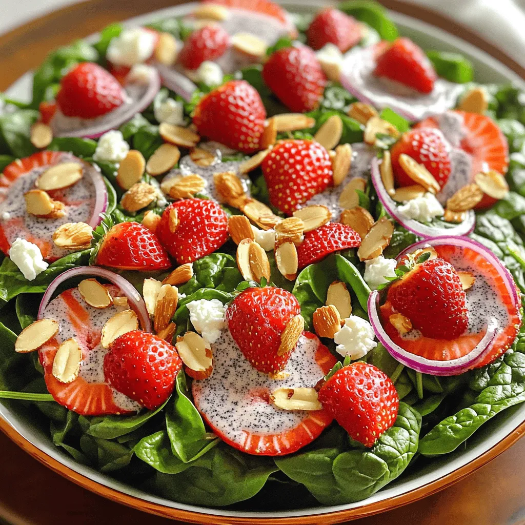 - 4 cups fresh baby spinach, washed and dried - 2 cups fresh strawberries, hulled and sliced - 1/2 cup crumbled feta cheese - 1/3 cup sliced almonds, toasted - 1/4 cup red onion, thinly sliced Fresh ingredients make this salad shine. Baby spinach is crisp and tender. It provides a great base. Fresh strawberries add sweetness and color. Feta cheese brings a creamy and salty touch. Sliced almonds give a nice crunch. Red onion adds a zesty flavor. Each ingredient has its role. Together, they create a balanced dish that excites the taste buds. - 1/4 cup olive oil - 2 tablespoons apple cider vinegar - 2 tablespoons honey - 1 tablespoon poppy seeds - Salt and pepper to taste The dressing pulls it all together. Olive oil creates a smooth texture. Apple cider vinegar adds tanginess. Honey sweetens the mix perfectly. Poppy seeds provide a unique crunch and visual appeal. Salt and pepper elevate the flavors. This dressing is quick to make and enhances each bite. With just a few simple ingredients, you can create a delightful topping that makes the salad feel special. Start by whisking the dressing ingredients in a small bowl. Use these items: olive oil, apple cider vinegar, honey, poppy seeds, salt, and pepper. Mix them well until they blend smoothly. This is key for a great taste. Next, let the dressing sit for a few minutes. This allows the flavors to meld together, creating a richer taste. Now, grab a large salad bowl. Add 4 cups of fresh baby spinach to the bottom. Then, layer on 2 cups of sliced strawberries. They add a sweet touch. Don't forget to sprinkle in 1/4 cup of thinly sliced red onion. This gives the salad a nice crunch and a bit of zing. Next, add 1/2 cup of crumbled feta cheese. It brings a creamy flavor. Finally, sprinkle 1/3 cup of toasted sliced almonds on top for extra crunch. Drizzle your prepared poppyseed dressing over the salad. Now, gently toss everything together. Make sure the greens and toppings are well coated in dressing. This helps every bite burst with flavor. After tossing, take a moment to taste the salad. Adjust the seasoning if needed. You might want more salt or pepper. Serve the salad right away for the best fresh taste. Enjoy your Strawberry Spinach Salad with Poppyseed Dressing! To make the poppyseed dressing just right, adjust the sweetness and tanginess. If you like it sweeter, add more honey. For extra tang, add a bit more apple cider vinegar. Taste as you go to find your perfect mix. You can try other dressings too. A balsamic vinaigrette adds a nice twist. A lemon vinaigrette can also brighten the flavors. Feel free to get creative! Layering your salad will make it look stunning. Start with the fresh baby spinach at the bottom. Then, add the sliced strawberries and red onion on top. This way, you see all the colors and textures. When mixing, gently toss the greens with your hands. This helps keep the spinach from wilting. You want everything to blend well without crushing the delicate leaves. This salad pairs well with grilled chicken or fish. The light flavors of the salad balance nicely with richer dishes. For leftovers, store the salad in a sealed container in the fridge. Enjoy it within one day for the best taste. If you have extra dressing, keep it separate to avoid soggy greens. {{image_2}} Other fruit options You can switch strawberries for other fruits. Try blueberries, raspberries, or diced peaches. Each fruit brings a new flavor. Feel free to mix and match to create your favorite taste. Cheese alternatives If you want a cheese swap, try goat cheese or even no cheese at all. Vegan cheese works well too. Each option will change the salad's texture and taste. Gluten-free options This salad is naturally gluten-free. All the ingredients are safe for gluten-free diets. Just ensure your dressing ingredients are gluten-free as well. Vegan adaptations To make this salad vegan, skip the feta cheese. Use avocado for creaminess. For the dressing, replace honey with maple syrup. This will keep the sweetness while staying plant-based. Using seasonal fruits and nuts In the summer, use fresh berries. In the fall, add apples or pears. Nuts like walnuts or pecans can add unique flavors based on the season. Change the salad with what is fresh around you. Adjusting for different times of the year Think about adding roasted squash in winter. You can also include citrus fruits in winter months for brightness. This keeps your salad fresh and exciting all year long. To keep your strawberry spinach salad fresh, store it in an airtight container. This helps prevent moisture loss and keeps the ingredients crisp. It's best to keep the dressing separate until serving. The salad stays fresh for about 1-2 days in the fridge. After that, the spinach may wilt, and the strawberries can become mushy. I do not recommend freezing the salad. Freezing changes the texture of fresh ingredients. However, you can freeze the poppyseed dressing. Pour it into a freezer-safe container, leaving space for expansion. Thaw it in the fridge overnight before using. When serving leftovers, do not reheat the salad. Instead, serve it cold straight from the fridge. If the salad seems dry, add a little extra dressing to brighten the flavors. For the best taste, enjoy the salad within two days after making it. To reduce the sweetness of the dressing, cut back on honey. You can also add more apple cider vinegar. This will give you a nice tang. Another option is to add a bit of mustard. Mustard adds flavor without extra sugar. Taste as you adjust. This way, you get the flavor balance just right. You can try many nuts in this salad. Walnuts add a rich taste. Pecans give a sweet crunch. Cashews offer a buttery texture. Experiment with your favorites. Just remember to toast them for extra flavor. The crunchiness will enhance the salad’s texture. Yes, but some parts should be added later. You can wash and dry the spinach ahead of time. Store it in a sealed bag. Slice strawberries and keep them in the fri