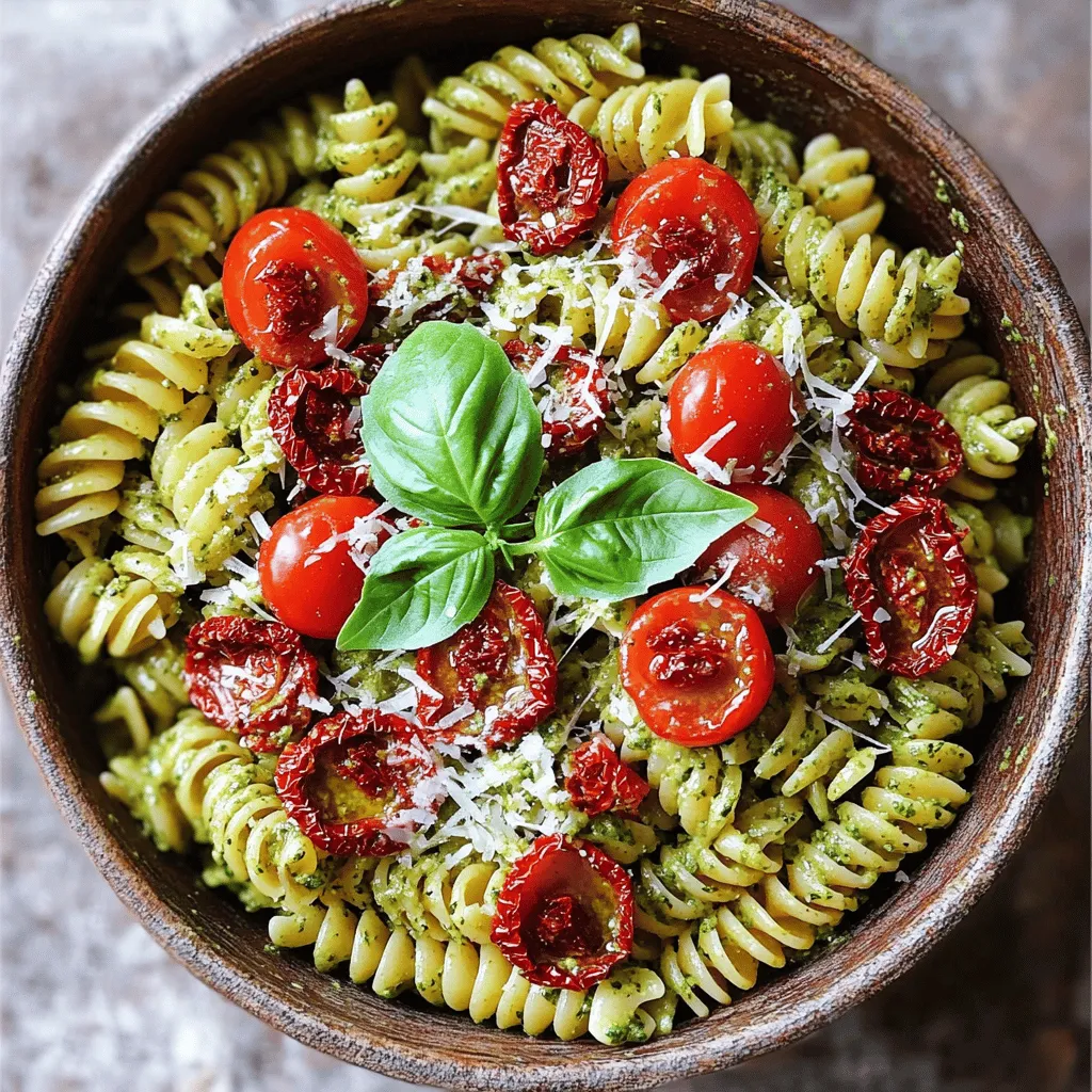 - Pasta options: You can use 300g of any pasta you like. Fusilli or penne work best. They hold the sauce well and add great texture. - Sun-dried tomatoes: Use 100g of sun-dried tomatoes. Drain them and chop into smaller pieces. They add a rich, tangy flavor to our dish. - Essential herbs and nuts: Fresh basil leaves are a must. You need about 50g for a bright taste. Add 30g of pine nuts for crunch and depth. - Cheese alternatives: Use 50g of grated Parmesan cheese for creaminess. If you want a vegan option, try nutritional yeast instead. It gives a cheesy flavor without dairy. - Additional flavorings: You’ll need 2 garlic cloves for a punch of flavor. Use 100ml of olive oil to help blend the pesto. Don’t forget salt and pepper to taste. These simple seasonings enhance all the flavors. This dish is easy to make and packed with flavor. Enjoy the process and have fun in the kitchen! To cook the pasta well, use a large pot. Fill it with water and add salt. Bring the water to a rolling boil. This helps give your pasta great flavor. Add the pasta and stir gently. Cook the pasta according to the package time. For al dente, check it a minute early. The pasta should be firm but not hard. Once ready, drain it, saving about 1 cup of the water. Set the pasta aside. Now, let’s make the sun-dried tomato pesto. Grab a food processor and add the sun-dried tomatoes, fresh basil, pine nuts, Parmesan, and garlic. Pulse these until they are finely chopped. Next, with the processor on, slowly pour in the olive oil. This helps the mixture blend into a smooth paste. If your pesto is too thick, add a bit of the reserved pasta water. This helps it become creamy and easy to mix. In a large bowl, mix the cooked pasta with the sun-dried tomato pesto. Toss well until every piece is coated. If it looks dry, add more pasta water. Season with salt and pepper to your taste. For a pop of color, add halved cherry tomatoes. They also add nice flavor. Serve your pasta warm. Garnish with extra Parmesan cheese and fresh basil leaves for a beautiful finish. Enjoy your meal! To store homemade pesto, keep it in an airtight container. Cover the top with a thin layer of olive oil to prevent browning. This keeps the fresh taste for about one week in the fridge. You can also freeze pesto in ice cube trays. This way, you can use just what you need later. For flavor enhancement, try adding a squeeze of lemon juice. This brightens the taste. You can also mix in some red pepper flakes for a bit of heat. If you want a creamier texture, add more olive oil or a splash of cream. Common pasta cooking mistakes include not salting the water. Use a good amount of salt; it should taste like the sea. Also, don’t rinse the pasta after draining. This removes the starch that helps the sauce stick. For the best texture, cook the pasta until it's al dente. This means firm but not hard. Check the package for timing, but start tasting a minute early. Pair your dish with grilled chicken or shrimp for extra protein. A side of roasted vegetables adds color and nutrition. For a light meal, serve it with a fresh salad. When plating, use a large, shallow bowl to showcase the pasta. Garnish with extra Parmesan and fresh basil leaves for a nice touch. If you have leftovers, warm them gently on the stove. Add a splash of water to keep the pasta moist. {{image_2}} You can easily swap ingredients in this recipe. For a vegan version, use nutritional yeast instead of cheese. It gives a nice, cheesy flavor without dairy. If you want a different texture, try using walnuts or cashews in the pesto. Both nuts add a creamy feel. To make this dish more filling, add proteins like grilled chicken or shrimp. Both pair well with the sun-dried tomatoes. If you like heat, spice it up with red pepper flakes. A dash of lemon zest adds a bright flavor that livens up the dish. Seasonal ingredients can take your pasta to the next level. Add fresh vegetables like zucchini or spinach for extra color and nutrients. Herbs like parsley or arugula also boost flavor. Adapting to what’s fresh can make your dish taste even better. To keep your sun-dried tomato pesto pasta fresh, store it in an airtight container. Make sure the pasta cools to room temperature before sealing. This helps avoid extra moisture, which can lead to sogginess. If you want to save your pesto, freeze it in ice cube trays. Once frozen, pop the cubes into a bag. You can use these cubes later in other dishes, like soups or sauces. When reheating your pasta, avoid the microwave if you can. Instead, use a skillet over low heat. Add a splash of water or olive oil to keep it moist. Stir gently until warmed through. This method helps prevent overcooking and keeps the flavors intact. You can also reheat it in the oven. Place the pasta in a baking dish and cover with foil. Heat at 350°F (175°C) for about 15 minutes. This method works well if you want to serve a larger portion. In the fridge, your sun-dried tomato pesto pasta can last up to three days. Make sure it stays sealed tightly to keep its flavor. If you freeze the pasta, it will last about two months. Just remember to label your container with the date. This way, you can enjoy this dish whenever you like! How long does it take to make sun-dried tomato pesto pasta? It takes about 25 minutes to make sun-dried tomato pesto pasta. You can prep your ingredients while the pasta cooks. Can I make sun-dried tomato pesto ahead of time? Yes, you can make the pesto ahead of time. Store it in the fridge for up to one week. Just add a bit of olive oil on top to keep it fresh. What can I substitute if I don’t have sun-dried tomatoes? If you don't have sun-dried tomatoes, try using roasted red peppers. They add a sweet taste and a nice red color. Is sun-dried tomato pesto pasta gluten-free? The dish can be gluten-free if you use gluten-free pasta. Many brands offer great options that taste just as good. What is the best type of pasta for pesto? Fusilli and penne are both g