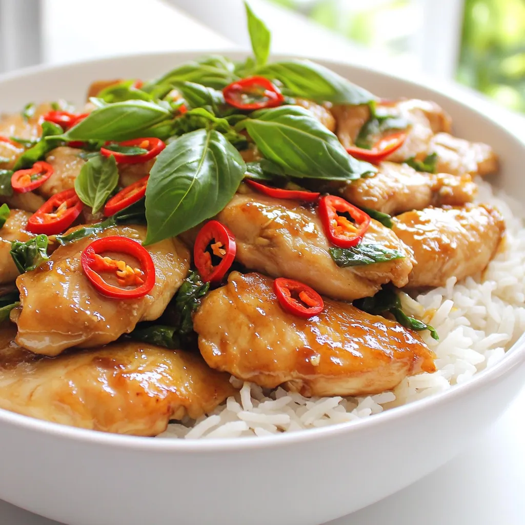 Now, you are ready to serve. Plate the Thai basil chicken over a bed of steamed jasmine rice. For a nice touch, garnish with extra basil leaves and slices of fresh red chili. You can also add lime wedges on the side. The lime adds a burst of freshness. Enjoy your meal!