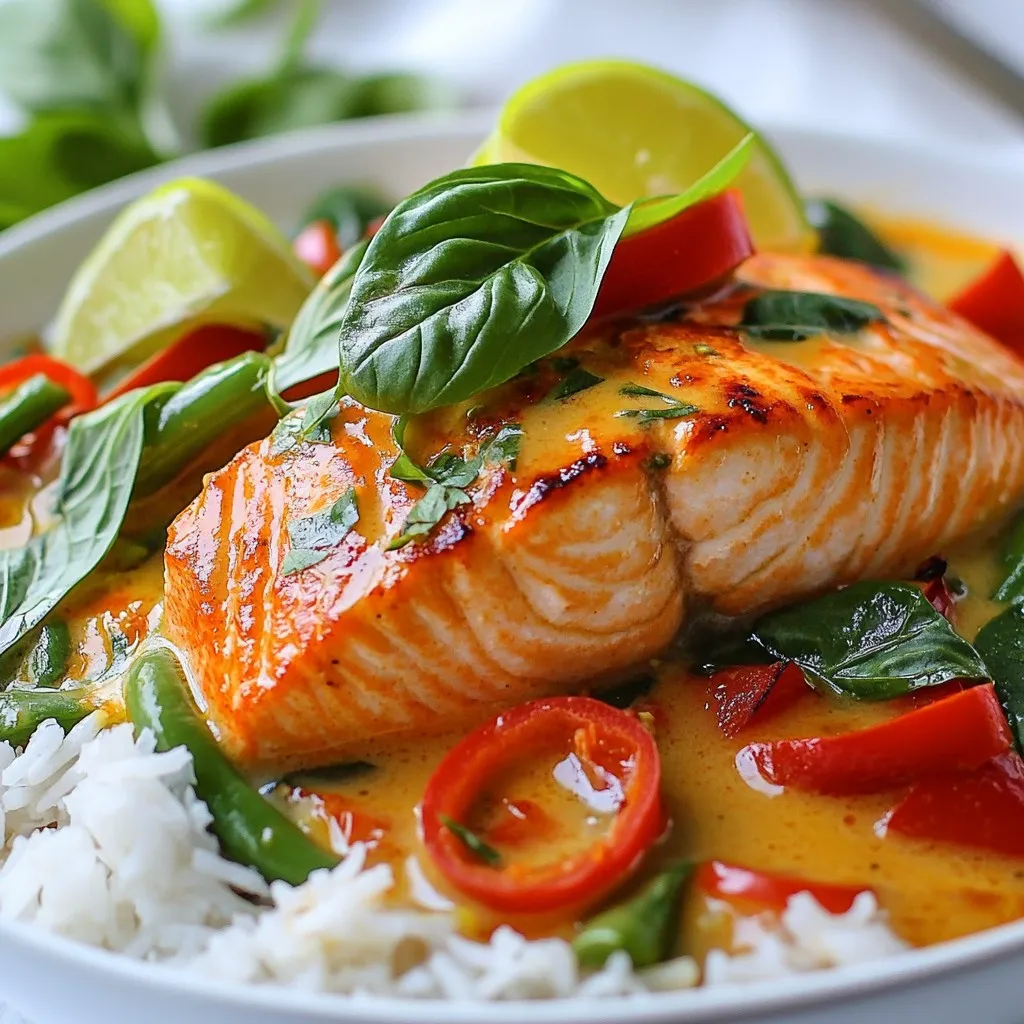 To make Thai Salmon Coconut Curry, you will need: - 2 salmon fillets, skinless and boneless - 1 can (400ml) coconut milk - 2 tablespoons red curry paste - 1 tablespoon fish sauce - 1 tablespoon brown sugar - 1 cup vegetable broth - 1 red bell pepper, sliced - 1 cup green beans, trimmed - 1 cup baby spinach - 2 tablespoons fresh lime juice - Fresh basil and cilantro for garnish - Cooked jasmine rice for serving You can swap some ingredients if needed: - Use chicken or tofu instead of salmon. - Swap coconut milk with almond or soy milk for a lighter option. - If you dislike red curry paste, try yellow or green curry paste. - Replace fish sauce with soy sauce for a vegetarian dish. - Use honey instead of brown sugar for a different sweetness. To cook this dish, you will need: - A medium saucepan for the curry. - A cutting board and knife for chopping. - A measuring cup for liquids. - A spatula or spoon for stirring. - A serving bowl for rice and curry. These tools make your cooking easier and help you create a tasty meal. {{ingredient_image_1}} To start, heat a bit of oil in a medium saucepan over medium heat. Add 2 tablespoons of red curry paste. Sauté this for about 1 minute until it smells great. Next, pour in 1 can of coconut milk and 1 cup of vegetable broth. Stir well to mix everything together. Bring this mixture to a gentle simmer. Now, add 1 tablespoon of fish sauce and 1 tablespoon of brown sugar. Stir until the sugar dissolves. This base gives your curry a rich flavor. Once the base is ready, bring the curry to a simmer again. Now, add 1 sliced red bell pepper and 1 cup of trimmed green beans. Cook these for about 5 minutes. You want the vegetables to soften but still have a nice crunch. This step adds color and texture to your dish. Gently add 2 skinless and boneless salmon fillets into the pan. Cook for 5 to 7 minutes. The salmon should be cooked through and flake easily with a fork. After that, stir in 1 cup of baby spinach. Cook until just wilted, which takes about 1 to 2 minutes. This adds a fresh taste. Remove the pan from heat and add 2 tablespoons of fresh lime juice. This brightens all the flavors. Serve your curry over cooked jasmine rice and garnish with fresh basil and cilantro. Enjoy your Thai salmon coconut curry! To make your Thai salmon coconut curry shine, focus on the balance of flavors. Use a good quality red curry paste, as this is your base. The richness of coconut milk adds creaminess. Fish sauce gives a salty kick, while brown sugar adds sweetness. Always taste as you go; adjust with lime juice for brightness. You want a dance of sweet, salty, and spicy. Cook the salmon until it flakes easily with a fork. Start by adding it gently to the simmering curry. Keep the heat medium-low to avoid overcooking. Salmon cooks quickly, so check after 5 minutes. If you prefer a firmer texture, cook it a minute longer. Remember, salmon continues to cook after you take it off the heat. Garnishing adds flair to your dish. Use fresh basil and cilantro for a vibrant touch. They bring a burst of color and flavor. Serve the curry over jasmine rice for a clean look. A lime wedge on the side adds a pop of color. This will impress your guests and make the dish even more inviting. Pro Tips Fresh Ingredients: Using fresh salmon and vegetables elevates the flavor of your curry and enhances its nutritional value. Adjust Spice Level: If you prefer a milder curry, reduce the amount of red curry paste or add more coconut milk to balance the heat. Garnish for Freshness: Adding fresh basil and cilantro not only adds color but also a burst of fresh flavor that complements the dish beautifully. Make it Ahead: This curry can be made in advance and stored in the fridge for up to 2 days, making it a great meal prep option. {{image_2}} You can switch out salmon for other proteins. Chicken works well in this dish. It cooks fast and absorbs flavors nicely. Shrimp is another great choice. It cooks quickly and adds a sweet taste. Tofu is perfect for a plant-based option. It soaks up the curry and gives a nice texture. To make this dish vegan, replace salmon with tofu or tempeh. Use vegetable broth instead of fish sauce. You can also skip the fish sauce altogether. Add more veggies like carrots or zucchini for extra flavor. This makes the curry colorful and fun. If you like heat, add more red curry paste. You can also add sliced fresh chilies. For a milder dish, start with less curry paste. Taste as you cook to find the right heat level. A little lime juice can also help balance the spice. Enjoy your perfect level of heat! After cooking Thai salmon coconut curry, let it cool first. Place leftovers in an airtight container. You can store it in the fridge for up to three days. This keeps the flavors fresh and tasty. To reheat, use a medium saucepan over low heat. Add a splash of water or broth if it seems thick. Heat until it's warm, stirring gently. You can also use the microwave. Heat in a microwave-safe bowl for about 1-2 minutes, stirring halfway through. If you want to save the curry for later, freezing works great. Portion it into freezer-safe containers. Leave some space at the top, as it may expand when frozen. It can last up to three months in the freezer. When ready to eat, thaw it overnight in the fridge before reheating. You can serve Thai Salmon Coconut Curry with cooked jasmine rice. This rice soaks up the curry's rich flavors well. You might also try serving it with quinoa for a nutty taste. A side of steamed broccoli or a fresh salad adds a nice crunch. Fresh herbs like basil or cilantro on top can brighten the dish. Yes, you can make this curry in advance. It tastes great after sitting for a while. Store it in an airtight container in the fridge. It will stay fresh for about three days. When you are ready to eat, just reheat it on the stove. Add a splash of vegetable broth to keep it creamy. Coconut milk has both good and bad aspects. It is creamy and full of flavor. It has healthy fat