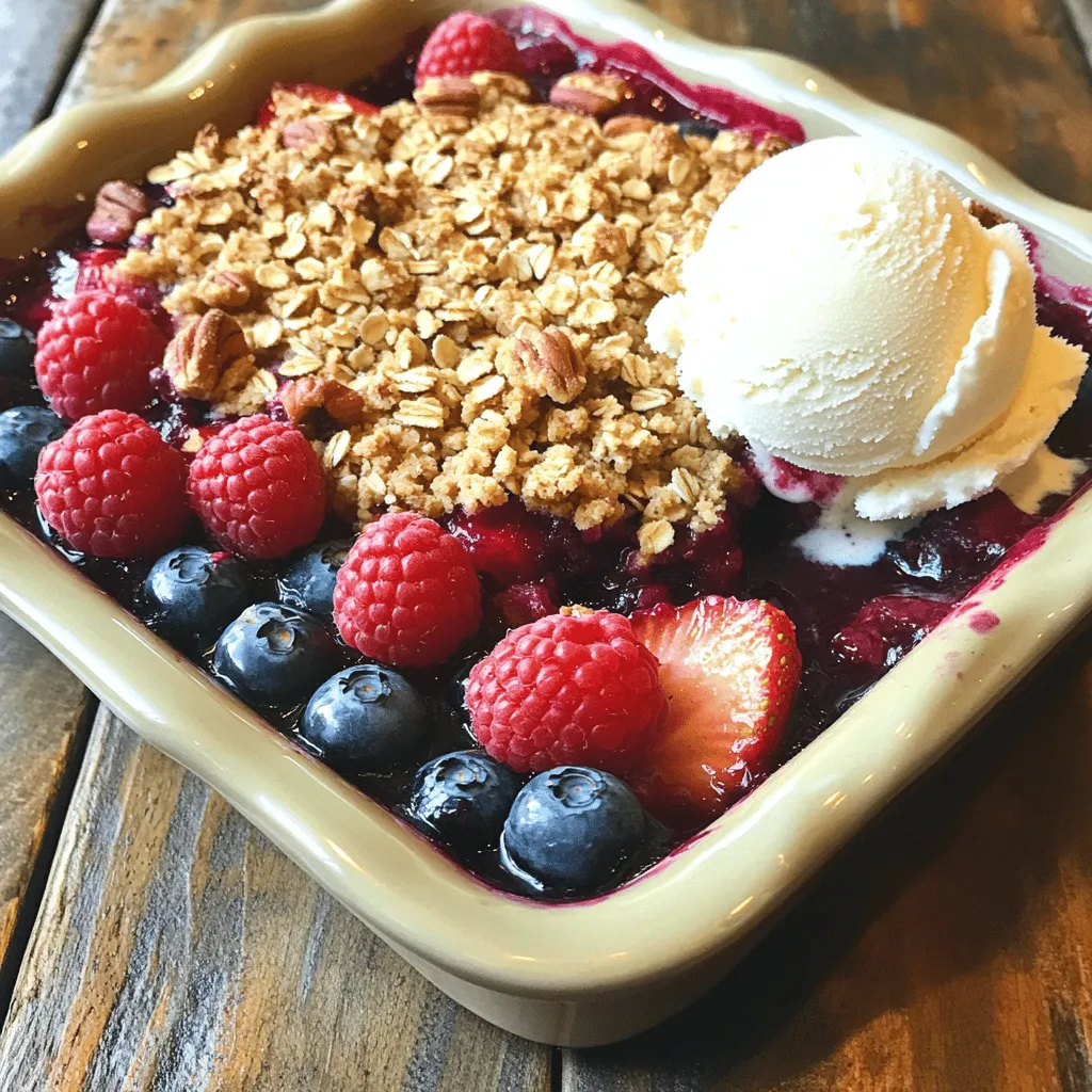 For this Triple Berry Crisp, you need three types of berries: - 1 cup strawberries, hulled and sliced - 1 cup blueberries - 1 cup raspberries When selecting berries, look for bright colors and firm textures. Choose strawberries that are deep red, blueberries that are plump and dry, and raspberries that are vibrant and intact. Avoid any that are mushy or have mold. Fresh berries taste best and have more nutrients. Here’s a list of all other necessary ingredients: - 1 tablespoon lemon juice - 1 tablespoon honey or maple syrup (optional) - 1 cup rolled oats - 1/2 cup all-purpose flour - 1/2 cup brown sugar - 1 teaspoon ground cinnamon - 1/4 teaspoon salt - 1/4 cup unsalted butter, melted - 1/4 cup chopped pecans or walnuts (optional) Feel free to add nuts for crunch or honey for extra sweetness. Each ingredient plays a key role in flavor and texture. Each serving has about 200 calories. Berries are low in calories and high in fiber. They provide vitamins C and K, and antioxidants that help your body. The oats in this recipe add whole grains, which are good for heart health. Enjoy this dessert knowing it has tasty and healthy ingredients! Start by washing your berries. Rinse them under cool water. For strawberries, remove the green tops and slice them. Combine one cup each of strawberries, blueberries, and raspberries in a big bowl. Add one tablespoon of lemon juice to brighten the flavors. If you want some sweetness, drizzle in one tablespoon of honey or maple syrup. Gently toss the berries together. Make sure they are coated in the lemon juice and honey. Once mixed, spread the berry mixture evenly in a greased 9-inch square baking dish. In another bowl, combine one cup of rolled oats, half a cup of all-purpose flour, half a cup of brown sugar, one teaspoon of ground cinnamon, and a quarter teaspoon of salt. Mix these dry ingredients well. Next, pour in a quarter cup of melted unsalted butter. Stir until the mixture looks crumbly. If you like nuts, fold in a quarter cup of chopped pecans or walnuts for some crunch. The goal is to have a nice, crumbly texture that will create a delightful topping. Preheat your oven to 350°F (175°C). Once your oven is ready, bake the crisp for 30 to 35 minutes. You want the top to turn golden brown and see the berries bubbling. To check if it’s done, look for that golden color and bubbling juices. When ready, remove it from the oven and let it cool for about 10 minutes. This cooling time helps the crisp set up nicely. Using frozen berries is a great option. They are often picked at peak ripeness. You can save time by using them directly from the freezer. Just add a little extra time for baking. If the mix looks too watery, add a bit more oats to soak it up. For sweetness, feel free to adjust the honey or maple syrup. You can also skip it if you prefer a tart taste. Serve your Triple Berry Crisp warm for the best taste. A scoop of vanilla ice cream or a dollop of yogurt complements it wonderfully. To make it look great, garnish with a few fresh berries. This adds color and freshness to your dish. You can also sprinkle a dash of cinnamon on top before serving for extra flair. One common mistake is overbaking. Keep an eye on the crisp; it should be golden brown. Under-seasoning is another pitfall. Always taste your berry mix before baking. If it needs more sweetness or a pinch of salt, add it. If your crisp turns out too dry, try serving it with a drizzle of honey or a splash of juice. {{image_2}} You can mix it up with different fruits. Instead of just berries, try peaches or apples. These fruits add a nice twist to the crisp. Seasonal fruits work great too. In the summer, use fresh cherries or plums. In the fall, try pears or cranberries. Just remember, any fruit that bakes well can shine in this dessert. If you need gluten-free options, swap regular flour for almond or coconut flour. You can also use gluten-free oats. For a vegan version, replace butter with coconut oil or vegan butter. Use maple syrup instead of honey for sweetening. If you're looking for a sugar-free option, choose a sugar substitute like stevia or erythritol. This way, everyone can enjoy this treat. Change the topping to suit your taste. You can add different nuts like almonds or walnuts. Seeds like sunflower or pumpkin seeds add a nice crunch too. For flavor, sprinkle in some nutmeg or ginger. You can also try adding cocoa powder for a chocolatey twist. These small changes make each crisp unique and fun! To keep your Triple Berry Crisp fresh, store it in the fridge. Use an airtight container. This will help keep the topping crisp and the berries juicy. If you have leftovers, try to let them cool first. Cover the crisp tightly with plastic wrap or foil. This way, it won't dry out in the fridge. You can freeze Triple Berry Crisp for later. First, let it cool completely. Then, cut it into portions. Wrap each piece tightly in plastic wrap, then place them in a freezer bag. When you want to enjoy it, thaw it in the fridge overnight. To reheat, bake it at 350°F (175°C) for about 15 minutes. This will help restore its warm, bubbly texture. In the fridge, your Triple Berry Crisp will last about 3 to 4 days. In the freezer, it can last up to 3 months. Always check for signs of spoilage. If it smells sour or looks moldy, it’s best to throw it away. You can use many berry types in your crisp. Strawberries, blueberries, and raspberries are the best choices. You can also try blackberries or even cranberries. Just remember, the fruit should be fresh and ripe for the best taste. Mix and match to find your favorite flavor combo. Frozen berries work too, but they may make your crisp a bit soggy. Yes, you can prepare Triple Berry Crisp ahead of time. Make the berry layer and topping separately. Store the berry mix in the fridge and the topping in a zip bag. When you're ready, combine them and bake. This method keeps your crisp fresh. If you want to bake it later, just store it in the fridge for u