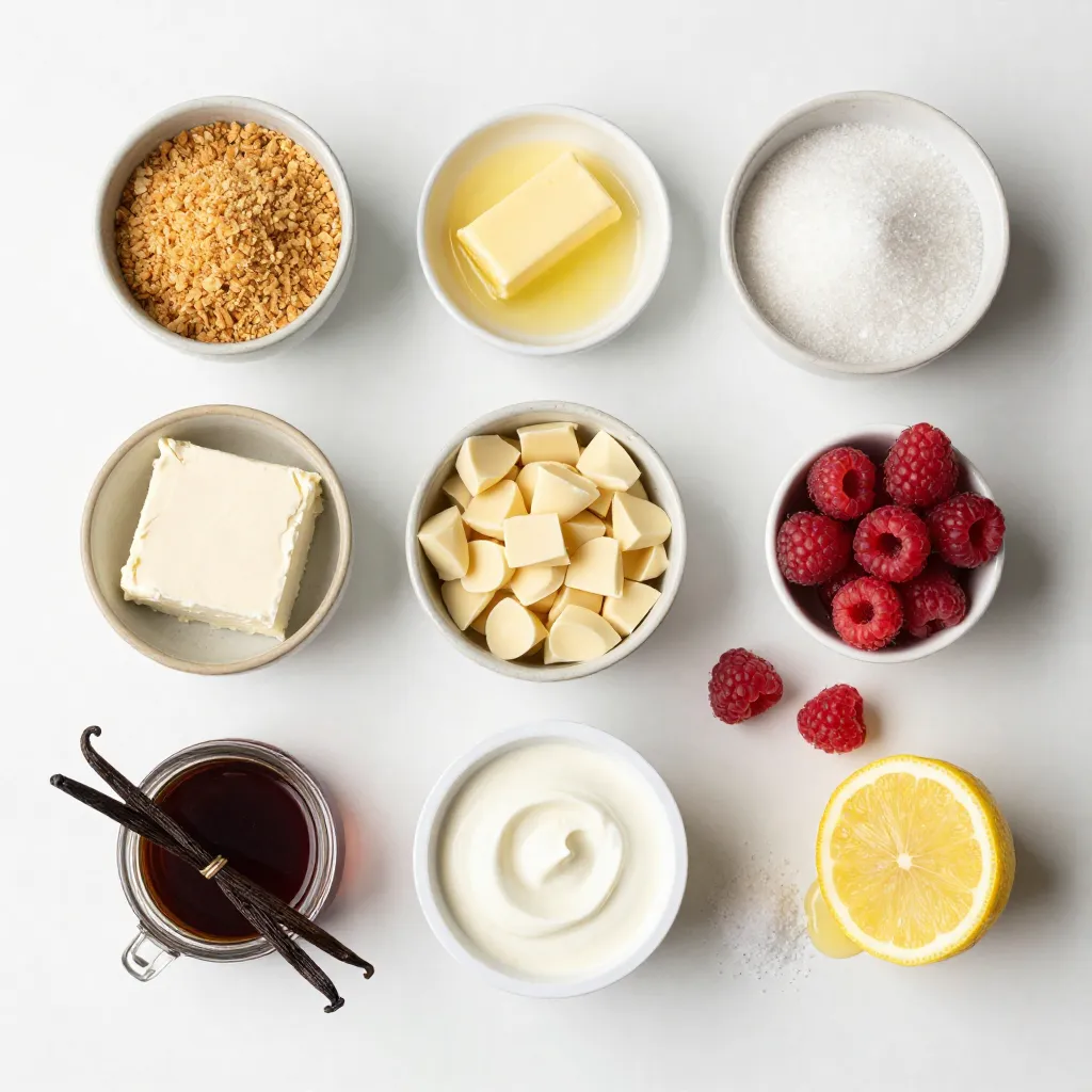 Each ingredient plays a role. The graham cracker crumbs form a tasty crust. If you like, you can swap them for crushed cookies. Butter binds it all together; use coconut oil if you want a dairy-free option. Sugar adds sweetness, but you can use honey or maple syrup instead. Cream cheese gives that rich texture. For a lighter option, try Greek yogurt. White chocolate chips add sweetness and creaminess. If you need a dairy-free choice, use dairy-free chocolate. Sour cream adds tang; plain yogurt works too. Fresh raspberries are key for flavor, but frozen ones can work in a pinch. Vanilla extract adds depth, while lemon juice brightens the taste.