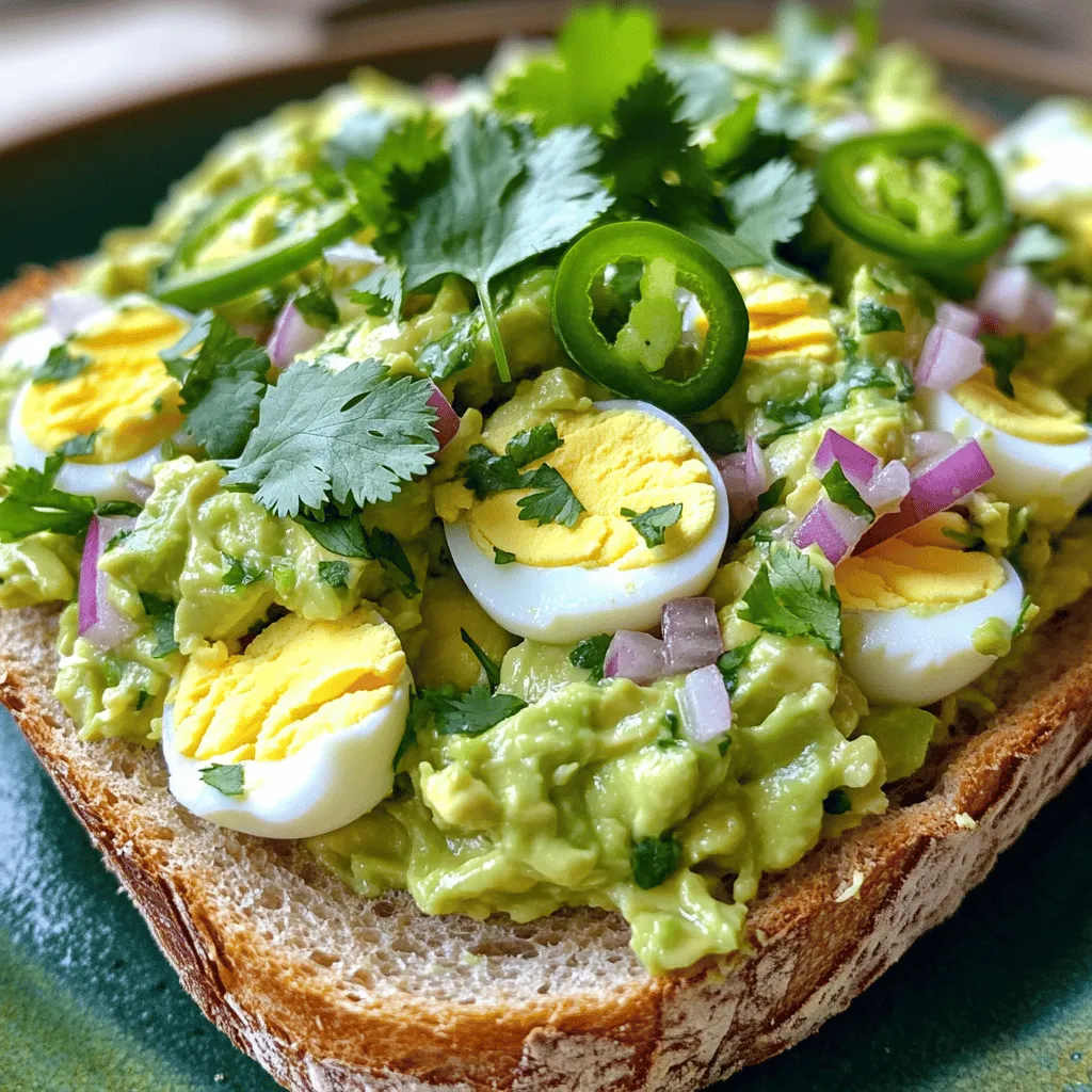 - 4 large eggs - 1 ripe avocado - 1 tablespoon Dijon mustard - 1 tablespoon plain Greek yogurt - 1 tablespoon lime juice - 1 small red onion, finely chopped - 1 small jalapeño, deseeded and minced - Salt and pepper to taste - Fresh cilantro leaves, chopped - Whole grain bread or lettuce leaves for serving This zesty avocado egg salad combines rich flavors and bright colors. Each ingredient plays a key role in creating depth and freshness. The eggs bring protein and creaminess, while the avocado adds a buttery texture. Dijon mustard offers a tangy bite, and the Greek yogurt keeps it light and smooth. Lime juice brightens the dish, adding a splash of freshness. Red onion brings a mild sweetness and crunch. The jalapeño adds a hint of heat, which you can adjust based on your taste. Lastly, fresh cilantro gives a herbaceous note that ties everything together. Use whole grain bread for a filling sandwich or serve it on crisp lettuce leaves for a lighter option. Each bite delivers a burst of flavor that you will love! - Place 4 large eggs in a pot and cover with cold water. - Bring the water to a boil, then reduce heat and simmer for 9-10 minutes. - After boiling, cool the eggs in an ice bath for easy peeling. - Once cool, chop the eggs into small pieces. - In a bowl, mash 1 ripe avocado until creamy. - Mix in 1 tablespoon of Dijon mustard, 1 tablespoon of plain Greek yogurt, and 1 tablespoon of lime juice. - Gently fold the chopped eggs into the avocado mixture. - Add 1 small finely chopped red onion and 1 small minced jalapeño. - Season with salt and pepper to taste. Adjust lime juice for more zest if you like. To get perfect hard-boiled eggs, start with fresh eggs. Place them in a pot and cover with cold water. Bring the water to a boil. When it boils, reduce the heat and let them simmer for 9-10 minutes. After cooking, move the eggs to an ice bath. This cools them quickly and makes peeling easier. Let them sit in the ice bath for at least 5 minutes. If you like heat, use jalapeño. For a milder flavor, use a sweet bell pepper instead. You can also try other peppers like poblano or banana peppers. Just remember to remove the seeds if you want less spice. Start with a small amount and taste as you go. This way, you can find your perfect spice level. Want to take your egg salad up a notch? Add fresh herbs like dill or parsley. Chives also work well for a light onion flavor. A pinch of smoked paprika can add a nice depth too. If you like tang, try adding a splash of apple cider vinegar. These small changes make a big difference in flavor! {{image_2}} You can switch up the protein in this dish. Try adding cooked chicken for a heartier meal. Chickpeas can add a nice texture and boost plant-based protein. If you want a vegan option, tofu works well too. Just crumble it before mixing. Each choice gives you a new flavor experience. To make this salad vegan, swap the eggs and dairy. Use mashed chickpeas instead of eggs. For creaminess, try avocado or a vegan yogurt. Lime juice adds the needed tang. Be sure to season well, as flavor is key in this vegan version. Want to mix it up? Add different dressings or spices. Smoked paprika offers a warm, rich flavor. You can also use garlic powder for a savory kick. Experiment with fresh herbs like dill or parsley for added freshness. Each tweak creates a unique twist on the classic salad. To store your Zesty Avocado Egg Salad, place it in an airtight container. This keeps it fresh and prevents odors from other foods. Try to finish it within three days for the best taste. If you have leftovers, always remember to cover the salad with plastic wrap or a lid. This helps keep it from browning, especially the avocado. Freezing avocado egg salad isn't the best option, but it can work. If you choose to freeze it, use a freezer-safe container. Leave some space at the top because it may expand. When you're ready to eat it, thaw the salad in the fridge overnight. After thawing, mix it well before serving. You might want to add a bit more lime juice to freshen the taste. In the fridge, the salad lasts about three days. After that, the flavors change, and the avocado may brown. If you notice any off smells or colors, it's best to toss it out. Enjoy your salad when it's fresh for the brightest flavors. Yes, you can make Zesty Avocado Egg Salad ahead of time. First, prepare it as directed. After mixing, store it in an airtight container. This keeps it fresh in the fridge for up to two days. If you want it extra fresh, add the avocado just before serving. This prevents browning. Zesty Avocado Egg Salad pairs well with many sides. Here are some great options: - Whole grain bread for sandwiches - Lettuce leaves for a lighter option - Fresh veggies like carrots and cucumbers - Chips for a crunchy contrast - A green salad for more color and crunch To make more servings, simply scale the ingredients up. For example, double the eggs and avocado for eight servings. Keep the same ratio for the other ingredients. This ensures the taste stays balanced. If you are unsure, start with small increments. Taste as you go for the best outcome. This blog post shared how to make a tasty Zesty Avocado Egg Salad. You learned the key ingredients, simple steps, and helpful tips to perfect your dish. We also discussed fun variations and storage tips to keep your salad fresh. In conclusion, this recipe is easy to customize and great for meals. Try it today and enjoy a delicious, healthy treat!
